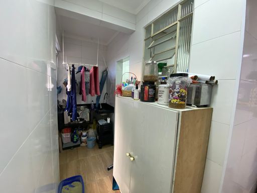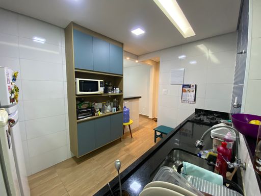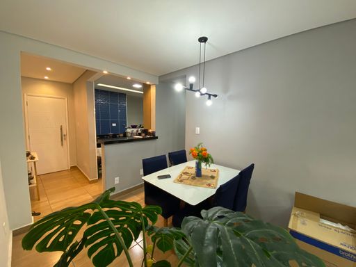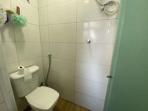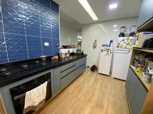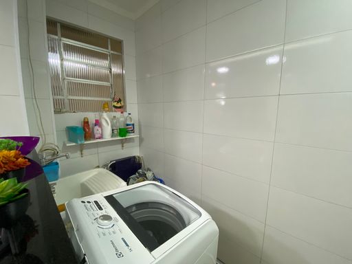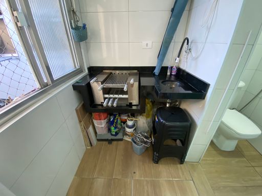 Sala, cozinha americana, banheiro social e de serviço, área de serviço com churrasqueira.