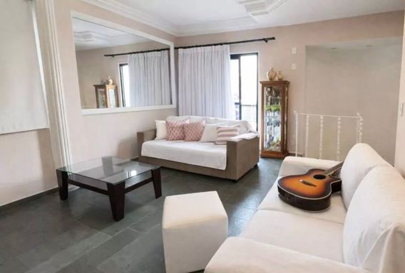 Piso superior - sala de estar, banheiro social, bar, área externa com piscina, pia e armários. Direito de uso de 2 vagas. Vista livre.