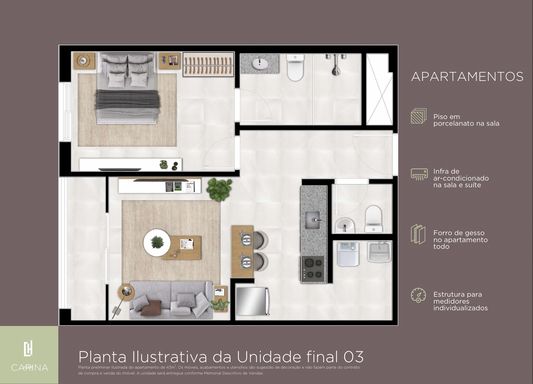 O Carina Home é a escolha perfeita para quem busca conforto, praticidade e localização privilegiada em Santos. Com apartamentos modernos de 43 m² a 53 m², todas as unidades contam com 1 suíte e lavabo, oferecendo um projeto inteligente e funcional para o dia a dia.