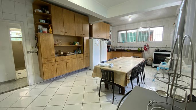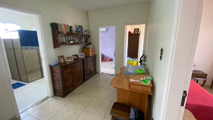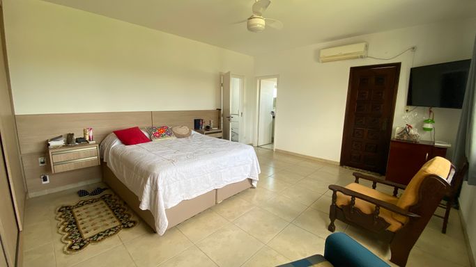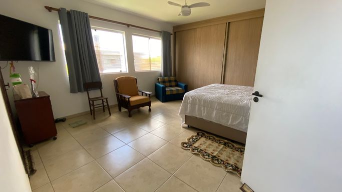 A casa principal conta com cinco dormitórios, sendo uma suíte com varanda de frente, onde hoje há uma charmosa horta, trazendo ainda mais qualidade de vida e bem-estar. Os ambientes são amplos, bem distribuídos, ventilados e arejados, com muitos móveis planejados e embutidos, garantindo praticidade e excelente aproveitamento dos espaços.